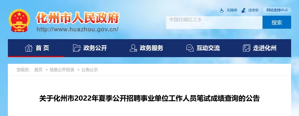原标题:关于化州市2022年夏季公开招聘事业单位工作人员笔试成绩查询的公告