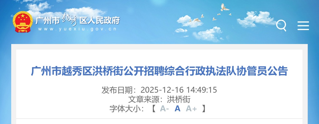 【2025广东广州市越秀区洪桥街招聘综合行政执法队协管员1人公告进入阅读模式】相关岗位: