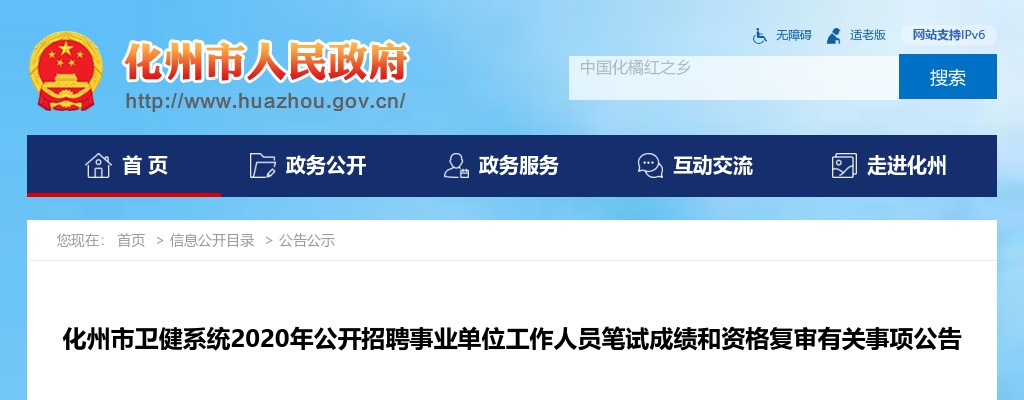 原标题:化州市卫健系统2020年公开招聘事业单位工作人员笔试成绩和资格复审有关事项公告